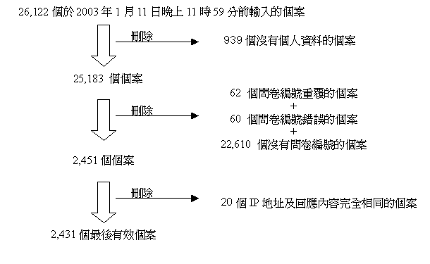 對於網上問卷編號重覆的個案,研究組只會處理最近一次輸入的意見。有關個案合共62個;此外,有60及22,610個個案因網上問卷編號錯誤或遺漏而被篩除。於此階段,有效個案減至2,451個。