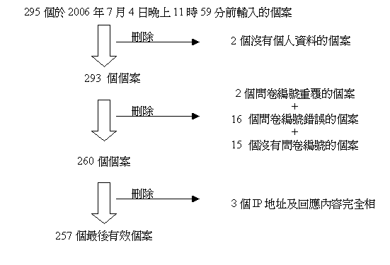 研究組共確認了25個IP地址相同的個案,於考慮資料輸入的時間、網址類別及意見內容後,3個個案因回應內容完全相同而被刪除。於是,有效樣本最後共有257個。 |
