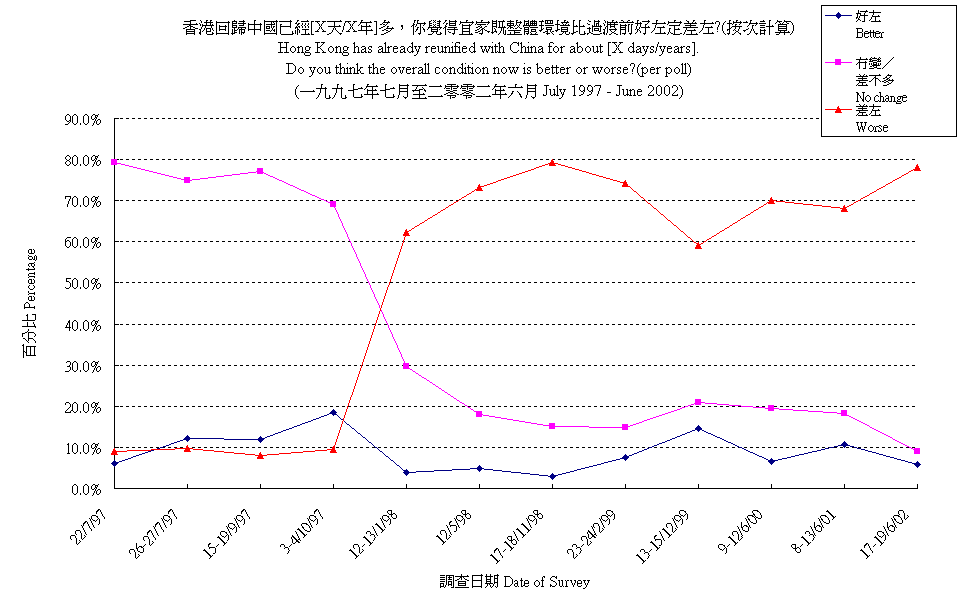 香港回歸中國已經[X天/X年],你覺得宜家既整體環境比過渡前好左定差左? Hong Kong has already reunified with China for about [X days/years]. Do you think the overall condition now is better or worse?