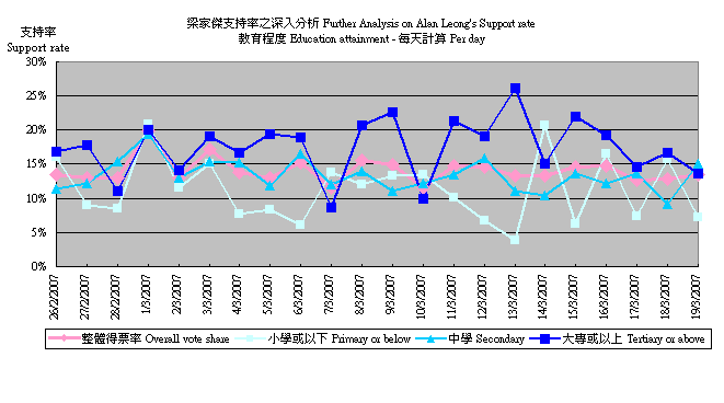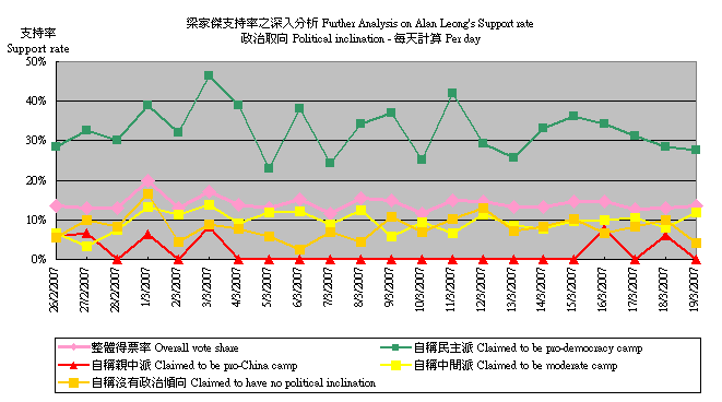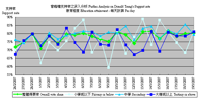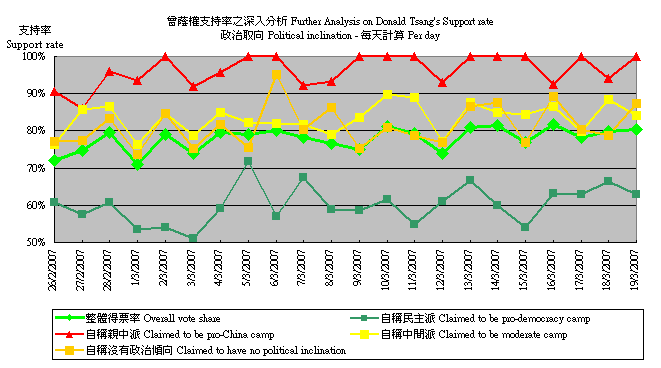 (1) 2月26日至3月19日滾動調查中,不同政治取向被訪者對曾蔭權支持程度的變化,以按日追蹤樣本計: |