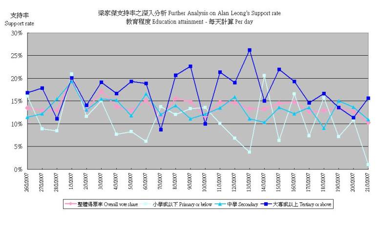 分析評論 民研計劃重點分析被訪者學歷和政治取態,與候選人支持程度的關係,是因為民研計劃在深入分析各項特首選舉調查數據後,認為這兩個因素比較值得注意。此外,由於按日追蹤數字能夠比較準確分析每日大事的影響,因此,在抽樣誤差容許的範圍內,可以結合選舉日誌分析巿民對候選人支持程度的變化。 就本公報所載的四個圖表,民意研究計劃主任鍾庭耀簡單分析:「按日追蹤調查顯示,巿民對兩名候選人的支持程度,到3月21日本公報的分析限期前基本上保持平穩,巿民對曾蔭權的整體支持度繼續緩緩上升,對梁家傑的支持度繼續緩緩下跌,但以最後變動計,仍然是在誤差範圍之內。」 |