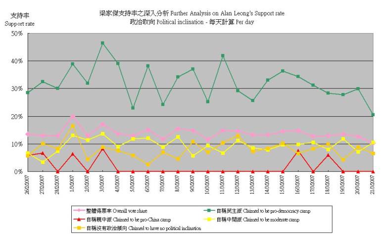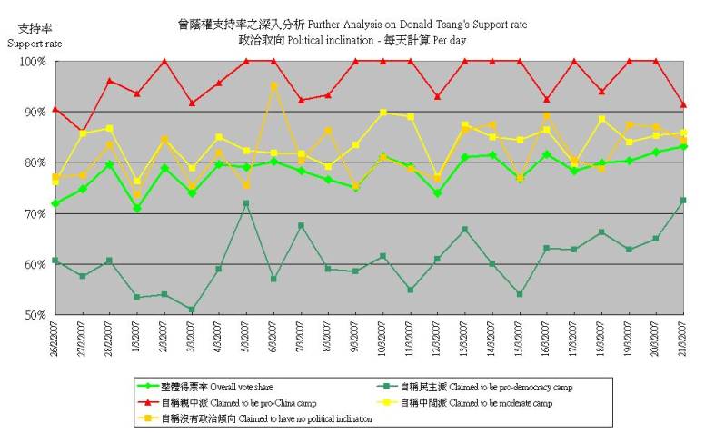 (1) 2月26日至3月21日滾動調查中,不同政治取向被訪者對曾蔭權支持程度的變化,以按日追蹤樣本計: |