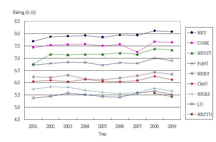 The aim of the first part of the survey was to study the general publicˇ¦s perception of the higher institutions funded through UGC, namely, City University of Hong Kong (CityU), Hong Kong Baptist University (HKBU), Lingnan University (LU), the Chinese University of Hong Kong (CUHK), the Hong Kong Institute of Education (HKIEd), the Hong Kong Polytechnic University (PolyU), the Hong Kong University of Science and Technology (HKUST) and the University of Hong Kong (HKU), plus Hong Kong Shue Yan University (HKSYU) which was included for the second time since last year. The order of these institutions was rotated randomly in different questionnaires in order to eliminate possible bias due to ordering. By means of a rating scale from 0-10, with 0 representing the worst, 10 representing the best and 5 being half-half, these institutions were assessed one by one with regard to their overall performance. |