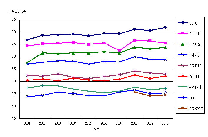 | The aim of the first part of the survey was to study the general public¡¦s perception of the higher institutions funded through UGC, namely, City University of Hong Kong (CityU), Hong Kong Baptist University (HKBU), Lingnan University (LU), the Chinese University of Hong Kong (CUHK), the Hong Kong Institute of Education (HKIEd), the Hong Kong Polytechnic University (PolyU), the Hong Kong University of Science and Technology (HKUST) and the University of Hong Kong (HKU), plus Hong Kong Shue Yan University (HKSYU) which was included for the third time since 2008. The order of these institutions was rotated randomly in different questionnaires in order to eliminate possible bias due to ordering. By means of a rating scale from 0-10, with 0 representing the worst, 10 representing the best and 5 being half-half, these institutions were assessed one by one with regard to their overall performance. |