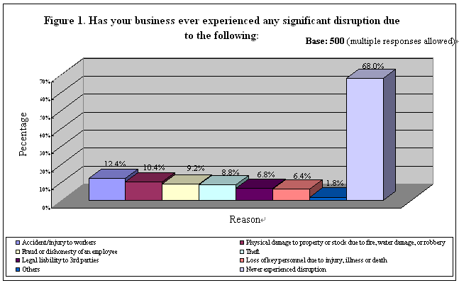 This survey comprised 9 simple opinion questions and ended by mapping some basic demographics of the company/respondent. The key findings of these questions are summarized below. Cross-references could be made with the tables in Appendix 2. Business Disruption in the Past The survey began by asking the respondents whether their business had experienced any serious disruption due to a number of factors. Results revealed that the majority (68%) of the SMEs interviewed had never experienced significant disruption before, while a respective of 12% and 10% said their business was seriously disturbed by “accident/injury to workers” and “physical damage to property or stock due to fire, water damage or robbery”. About one-tenth were affected by “theft” (9%) and “fraud or dishonesty of employees” (9%). Relatively fewer companies had encountered disruption due to “legal liability to 3rd parties” (7%), “loss of key personnel due to injury, illness or death” (6%) and also some other problems (2%, Table 3). See Figure 1.