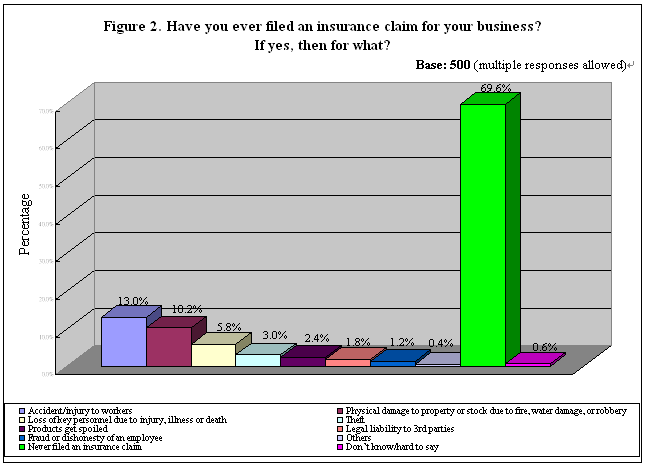 Consistent with the finding that many SMEs had not experienced any serious disruption to their business prior to the interview, as high as 70% had not filed an insurance claim either. Meanwhile, 13% of the overall sample made a claim for “accident/injury to workers”. “Physical damage to property or stock due to fire, water damage or robbery” and “loss of key personnel due to injury, illness or death” claims followed behind, which accounted for 10% and 6% respectively (Table 4). See Figure 2 for all categories.