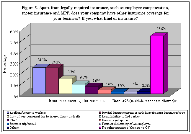Existing Insurance Coverage Apart from legally required insurance, such as employee compensation, motor insurance and MPF, around one-quarter of the respondents’ companies were insured against “accident/injury to workers” (25%) and “physical damage to property or stock due to fire, water damage or robbery” (24%). Another 14% had insurance coverage for the “loss of key personnel due to injury, illness or death”. However, more than half (54%) of the respondents said their business was not protected by other kinds of insurance (Table 5). See Figure 3.