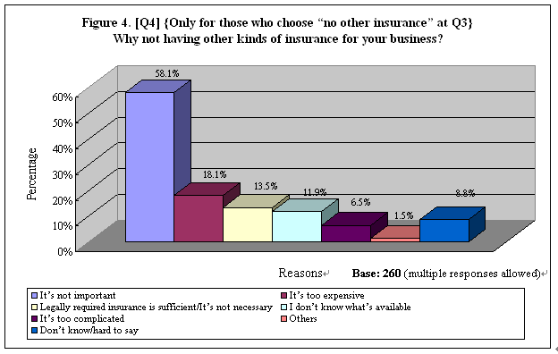 When further asked why they did not go for other kinds of insurance apart from those legally required, 58% of this sub-group said “it was not important” to their business. Another 18% did not have it because they thought “it was too expensive” while 14% believed “it was not necessary” as fulfilling the legal requirement was already good enough. Besides, over one-tenth (12%) admitted they were ignorant about what insurance product was available in the market and finally, 7% said “it was too complicated” (Table 6). See Figure 4.
