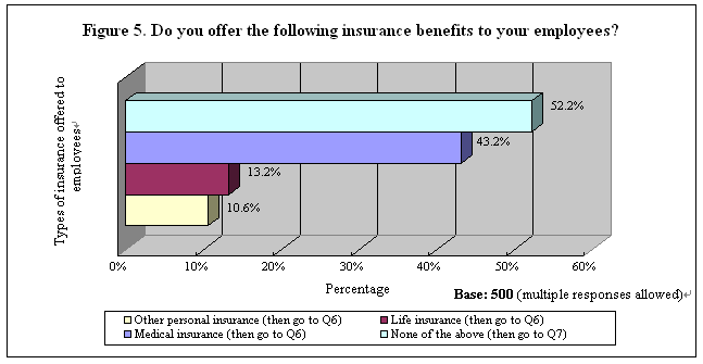 The survey continued to ask the respondents what insurance benefits they had offered to their employees. Results revealed that 52% of the SMEs interviewed offered nothing to their employees in this aspect, whereas 43% had “medical insurance” and 13% provided “life insurance” as well. The percentage of “other personal insurance” accounted for 11% of the total sample (Table 7). See Figure 5.