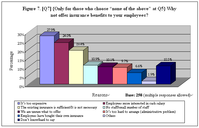 For those who did not provide any insurance benefits to their staff, the survey further probed their reasons behind. It is found out that the “cost consideration” was the most common hindrance as cited by these employers (28%), closely followed by the option that “employees were more interested in cash salary” (24%). Other popular reasons included “the existing benefits were sufficient / it was not necessary” (19%), “no staff / small number of staff” (11%), “unsure what to offer” (10%) as well as “administrative problem” (10%, Table 9). See Figure 7 for more answers.