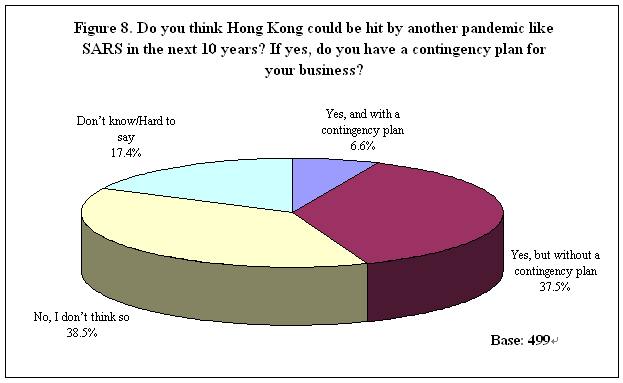 Future Plan for Pandemic like SARS As the last part of the survey, all respondents were asked if they thought Hong Kong would be hit by another pandemic like SARS in the next 10 years. Results showed that 44% of the SMEs in this sample said “yes” but only 7% had a contingency plan for this while the remaining 38% were not prepared. Another 39% thought it was not likely to have another pandemic striking Hong Kong within the next decade, and hence remained unprepared too. Finally, 17% could not even give a definite answer (Table 10). In other words, only less than 10% of these companies had contingency planning if another pandemic really occurred in near future. See Figure 8.