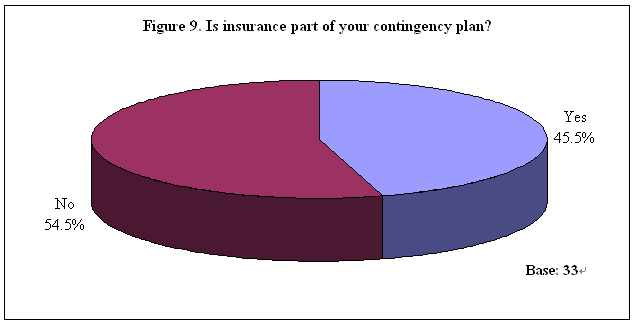 The survey ended by a follow-up question with those who answered “yes, and with a contingency plan” for yet another pandemic in the next 10 years (33 respondents only) to see if insurance was part of their plan. Results showed that 46% (15 respondents) said “yes” whereas 55% (18 respondents) did not have any insurance element in their future plan (Table 11). See Figure 9.