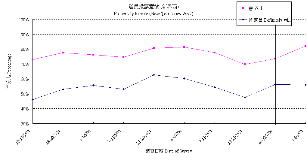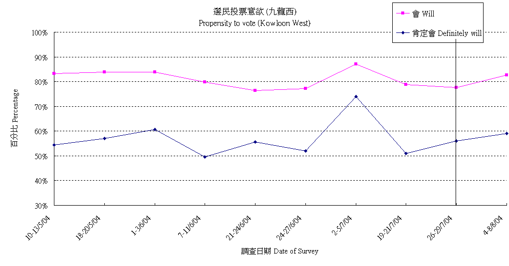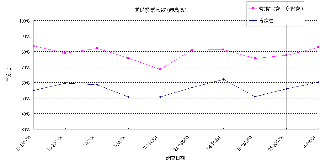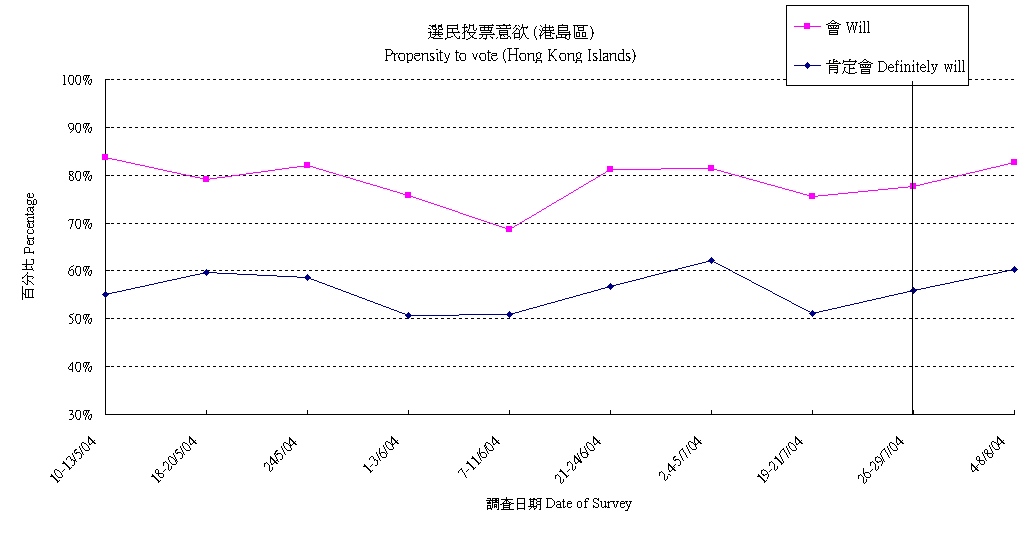 | 調查日期 | 肯定會 | 多數會 | 會 | 多數不會 | 肯定不會 | 不會 | 未決定/唔知/難講 | 合計 |