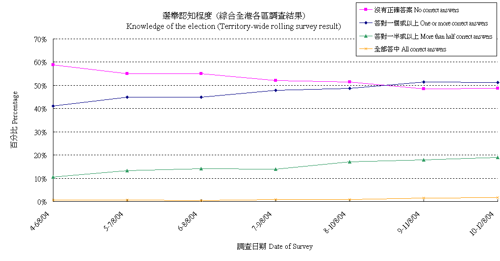 | 調查日期 | 沒有正確答案 | 答對一個或以上 | 答對一半或以上 | 全部答中 |