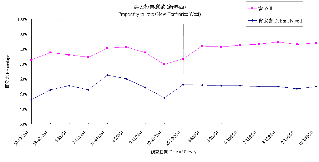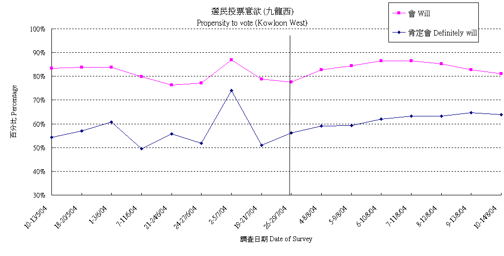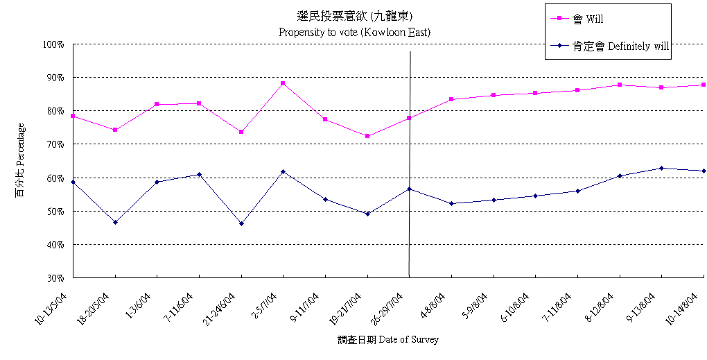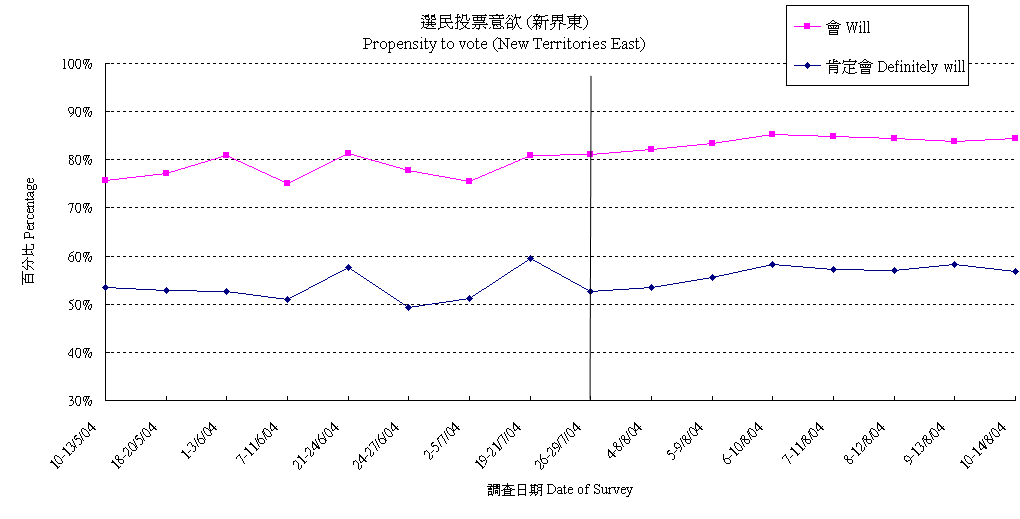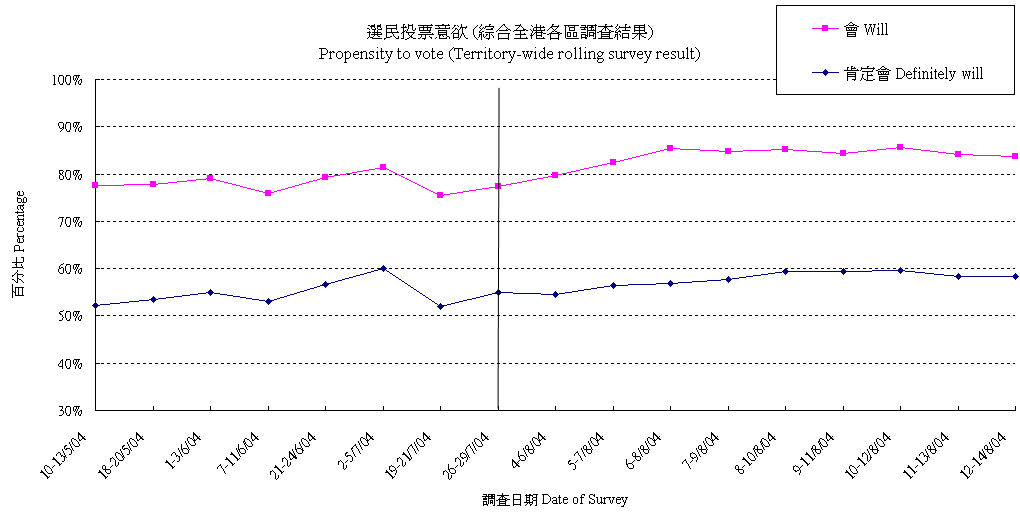 | 調查日期 | 肯定會 | 多數會 | 會 | 多數不會 | 肯定不會 | 不會 | 未決定/唔知/難講 | 合計 |