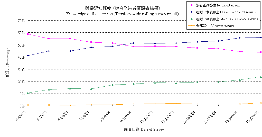 | 調查日期 | 沒有正確答案 | 答對一個或以上 | 答對一半或以上 | 全部答中 |