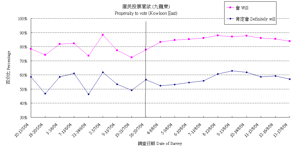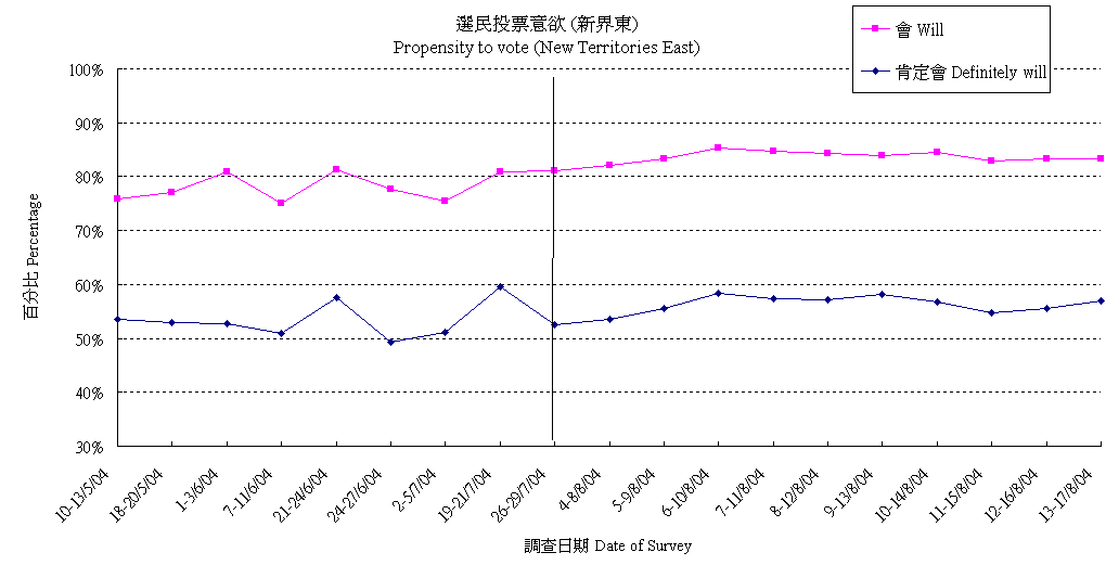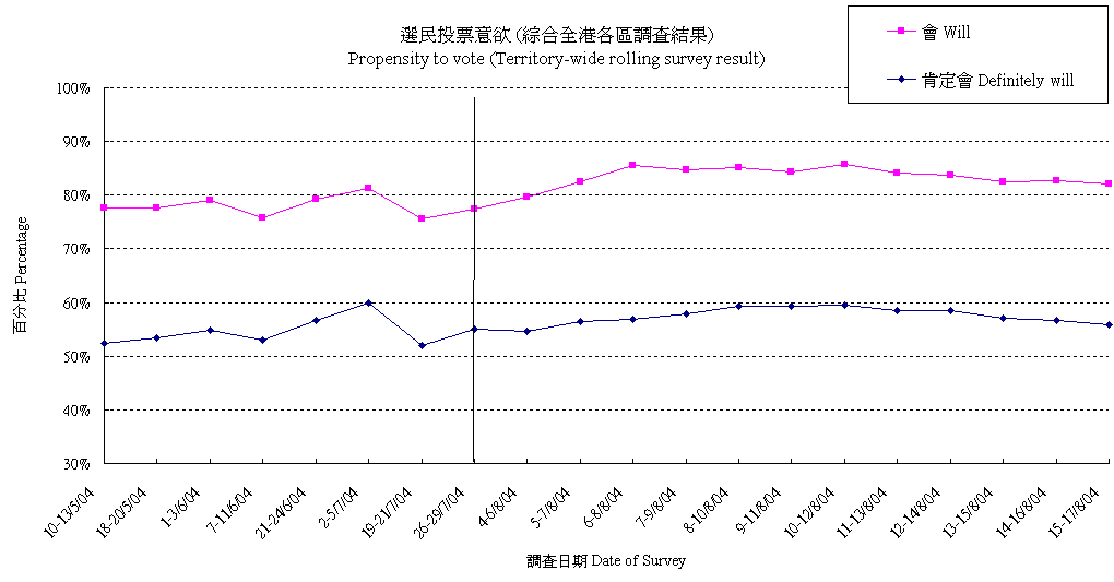 | 調查日期 | 肯定會 | 多數會 | 會 | 多數不會 | 肯定不會 | 不會 | 未決定/唔知/難講 | 合計 |