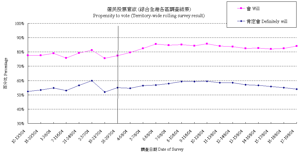 | 14-18/8/04 | 61.9% | 18.3% | 19.8% | 100.0% |