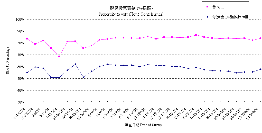 | 調查日期 | 肯定會 | 多數會 | 會 | 多數不會 | 肯定不會 | 不會 | 未決定/唔知/難講 | 合計 |