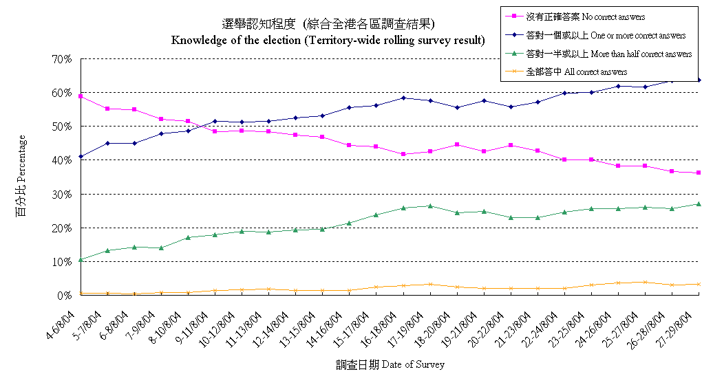 | 調查日期 | 沒有正確答案 | 答對一個或以上 | 答對一半或以上 | 全部答中 |