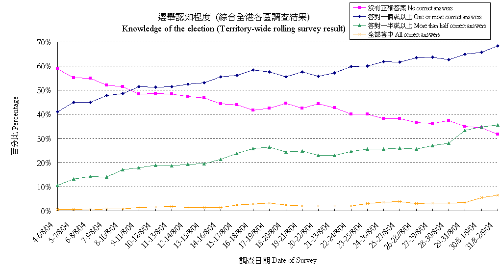 | 調查日期 | 沒有正確答案 | 答對一個或以上 | 答對一半或以上 | 全部答中 |
