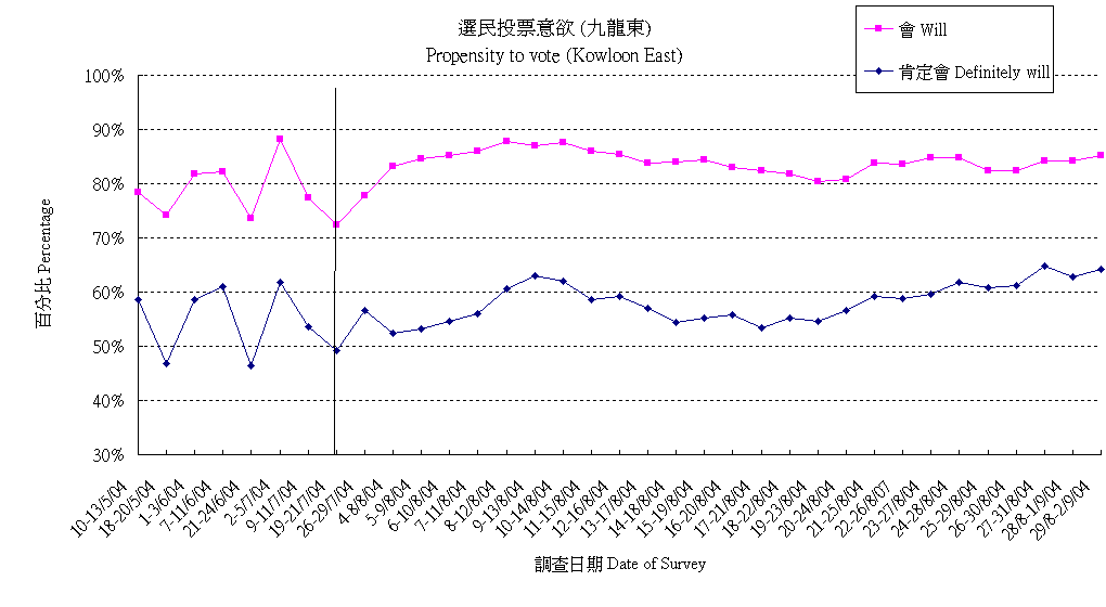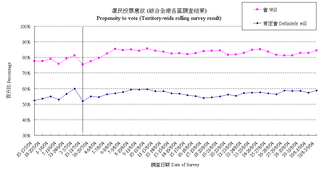 | 唔會投票 | 1.9% | 1.0% | 1.2% | 1.0% | 1.3% | 1.6% | 2.3% | 1.6% | 2.1% | 2.3% | 2.7% | 2.0% | 2.0% | 2.5% | 2.6% | 2.1% | 1.9% | 2.1% | 1.8% | 1.3% | 1.7% | 2.2% | 2.3% | 2.9% | 3.8% | 3.7% |