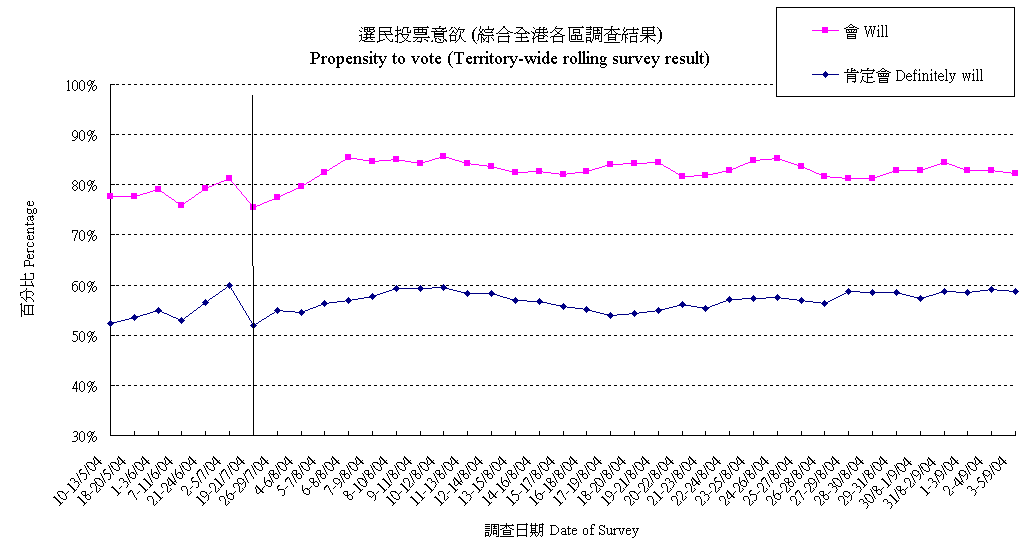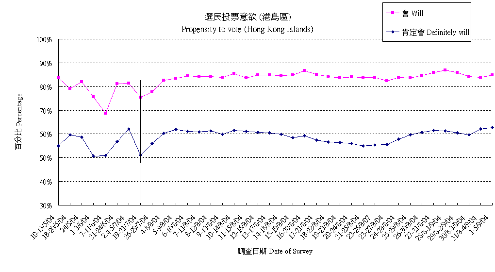 | 唔會投票 | 1.9% | 1.0% | 1.2% | 1.0% | 1.3% | 1.6% | 2.3% | 1.6% | 2.1% | 2.3% | 2.7% | 2.0% | 2.0% | 2.5% | 2.6% | 2.1% | 1.9% | 2.1% | 1.8% | 1.3% | 1.7% | 2.2% | 2.3% | 2.9% | 3.8% | 3.7% | 3.6% | 3.3% | 2.8% |