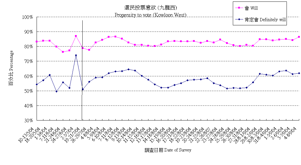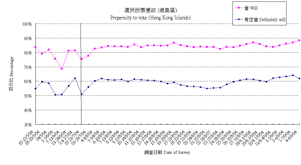 | 唔會投票 | 1.9% | 1.0% | 1.2% | 1.0% | 1.3% | 1.6% | 2.3% | 1.6% | 2.1% | 2.3% | 2.7% | 2.0% | 2.0% | 2.5% | 2.6% | 2.1% | 1.9% | 2.1% | 1.8% | 1.3% | 1.7% | 2.2% | 2.3% | 2.9% | 3.8% | 3.7% | 3.6% | 3.3% | 2.8% | 2.3% | 2.3% | 2.2% |