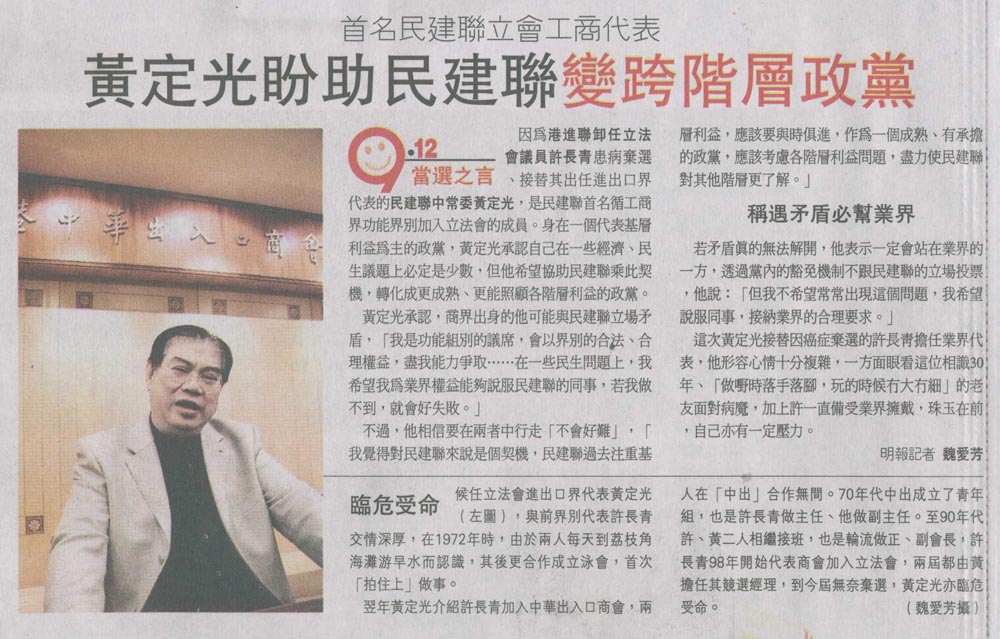 明報 - 首名民建聯立會工商代表 黃定光盼助民建聯變跨階層政黨