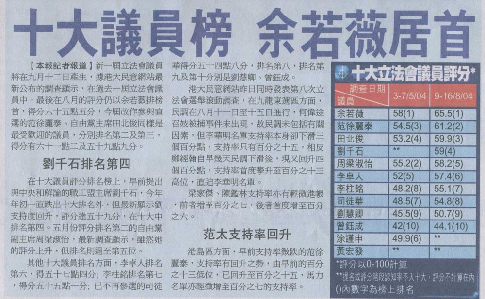新報 - 十大議員榜余若薇居首