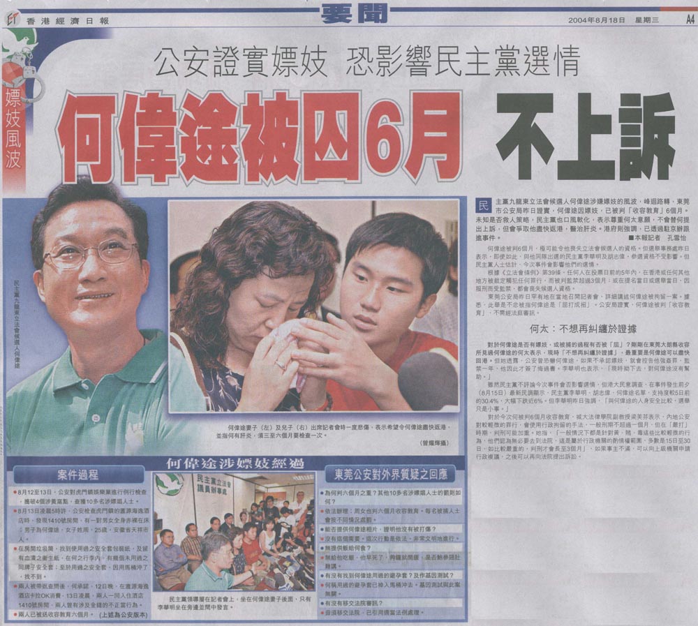 經濟日報 - 何偉途被囚6月 不上訴 公安證實嫖妓 恐影響民主黨選情