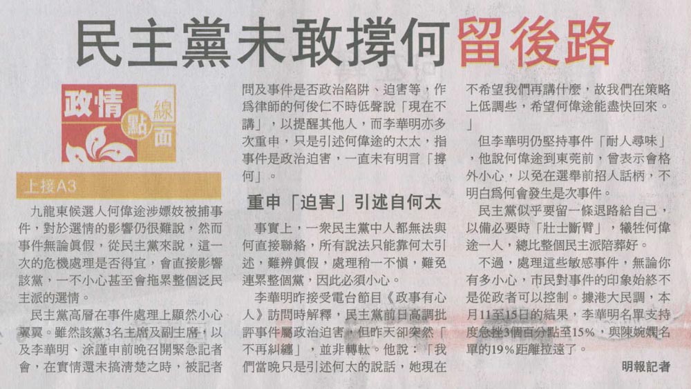 明報 - 民主黨未敢撐何留後路