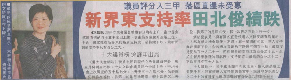 太陽 - 議員評分入三甲落區直選未受惠 新界東支持率田北俊續跌