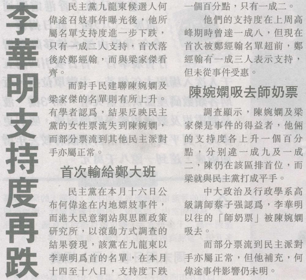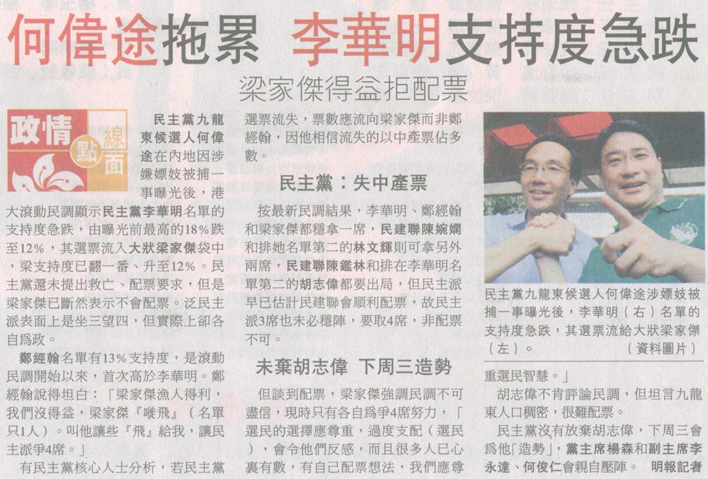明報 - 何偉途拖累李華明支持度急跌 梁家傑得益拒配票