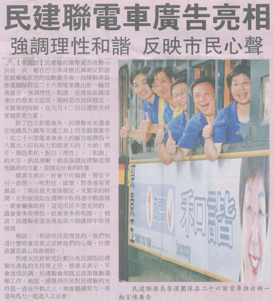 大公 - 民建聯電車廣告亮相 強調理性和諧反映市民心聲