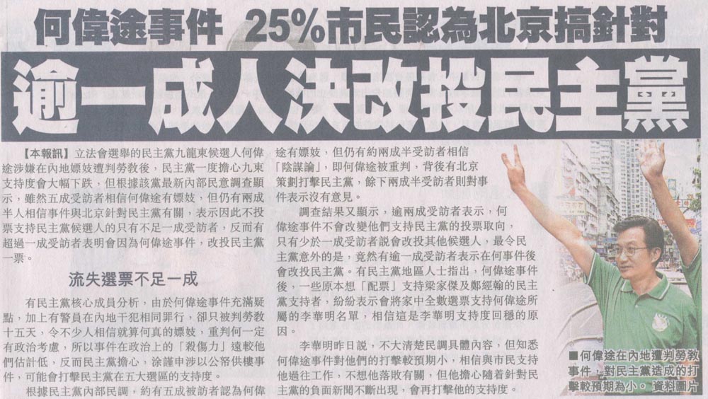 蘋果 - 何偉途事件 25%市民認為北京搞針對 逾一成人決改投民主黨