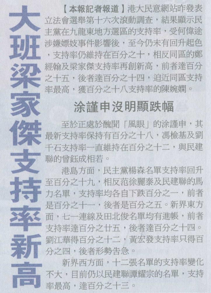 新報 - 大班梁家傑支持率新高