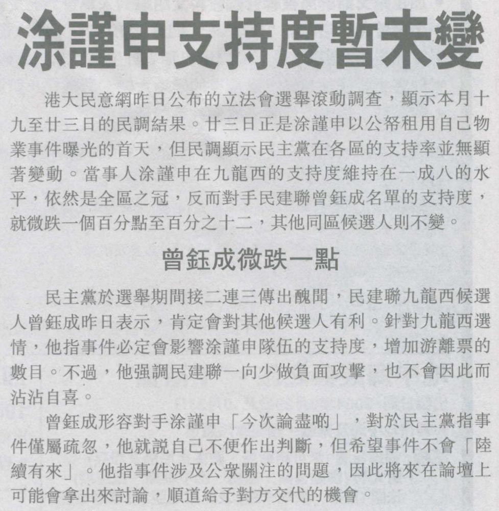 星島 - 涂謹申支持度暫未變