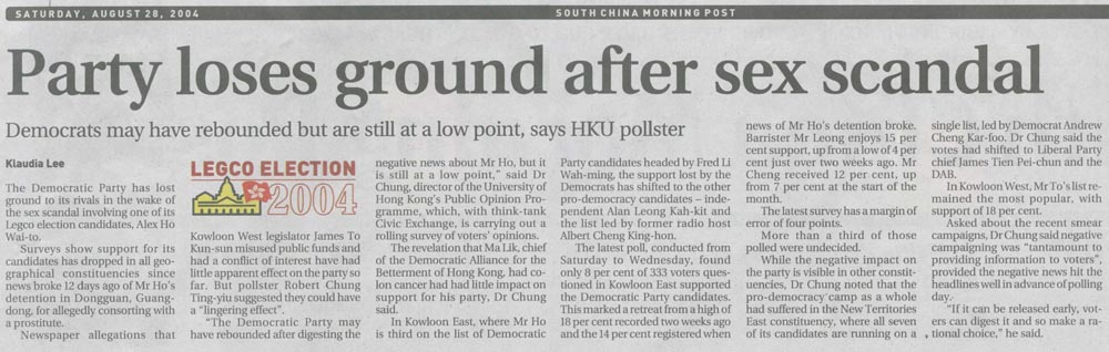 SCMP - Party loses ground after sex scandal