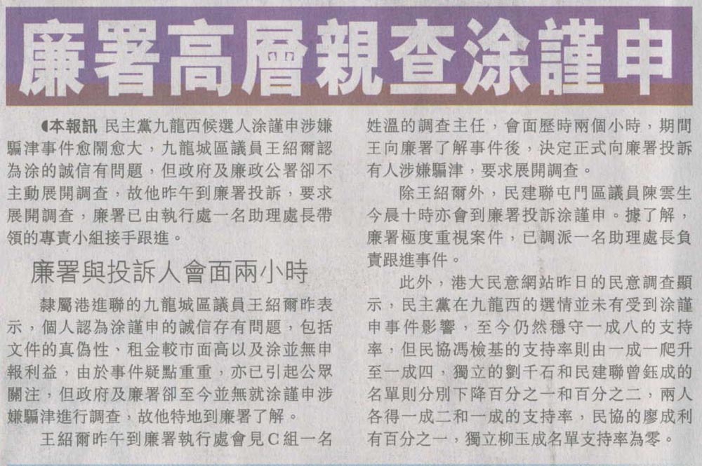 明報 - 王紹爾廉署投訴涂謹申 何偉途案民主黨九東新東打擊大