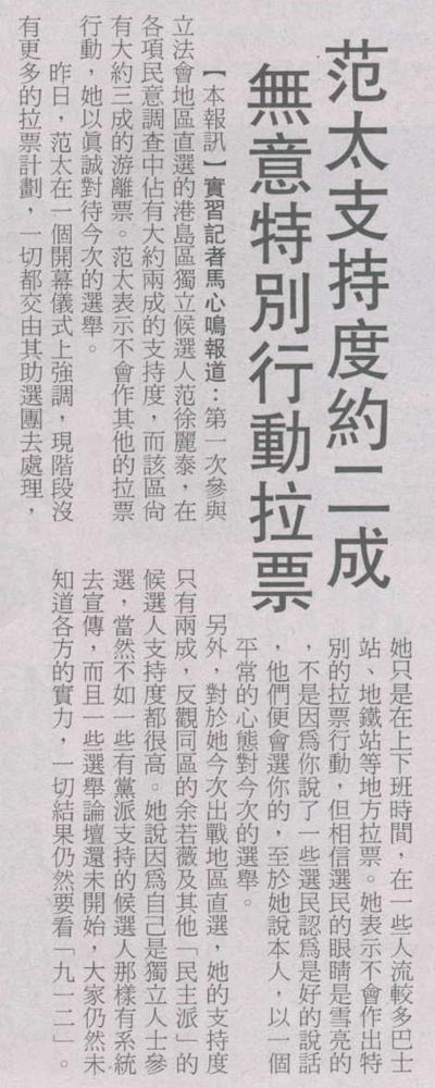 大公 - 范太支持度約二成 無意特別行動拉票
