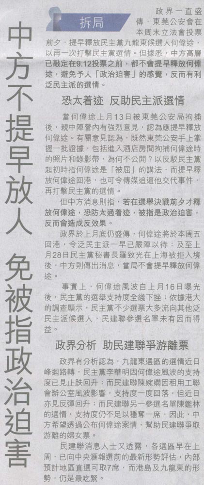 經濟日報 - 中方不提早放人 免被指政治迫害