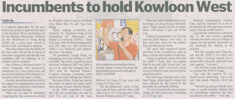 Standard - Incumbents to hold Kowloon West