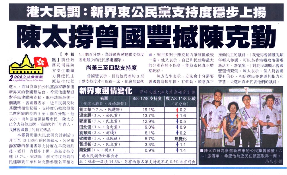 蘋果 - 港大民調:新界東公民黨支持度穩步上揚2008立法會選舉:陳太撐曾國豐撼陳克勤