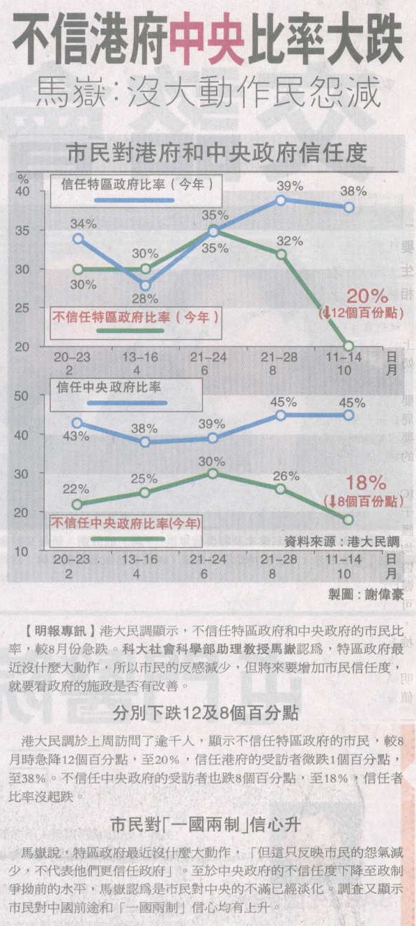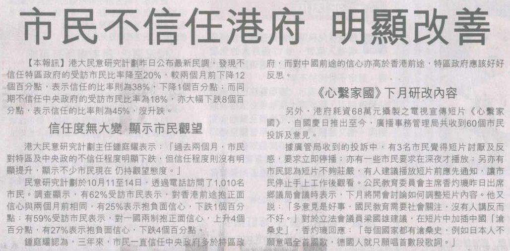 明報即時新聞 - 1510 民調指港人較信任中央政府 (19/10/2004)
