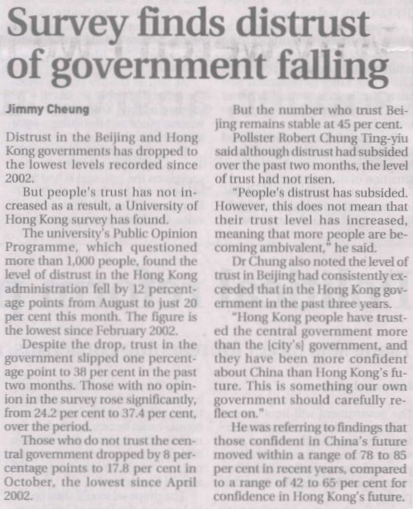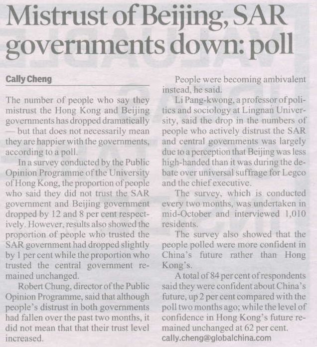 南華早報 - Survey finds distrust of government falling (英語, 20/10/2004)