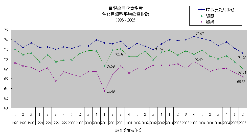 各節目類型平均欣賞指數及認知率 (1998 - 2005)