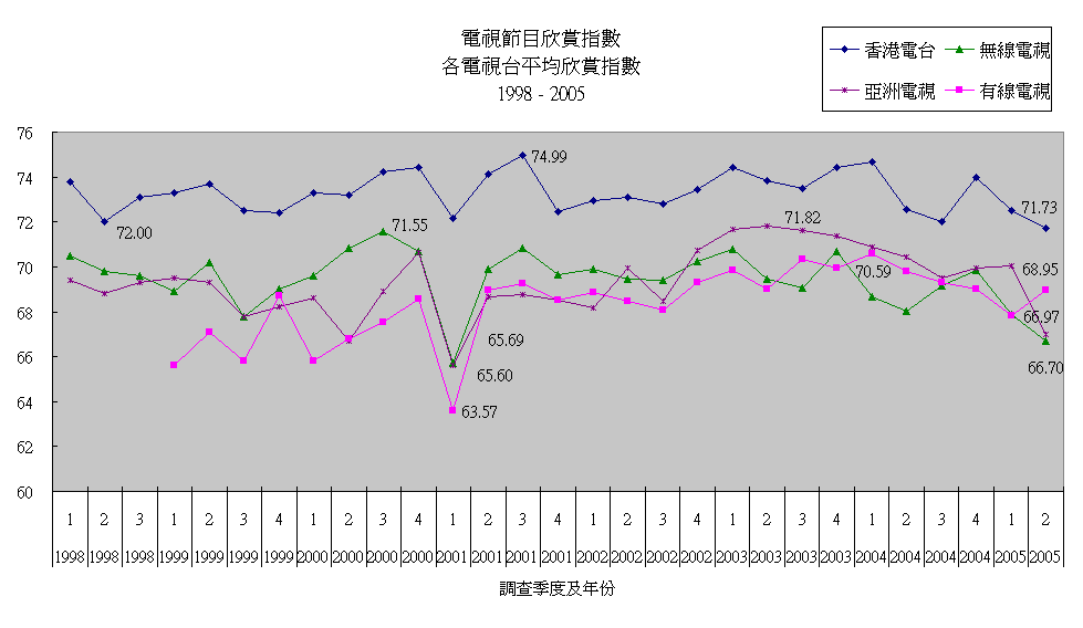 各電視台平均欣賞指數及認知率 (1998 - 2005)