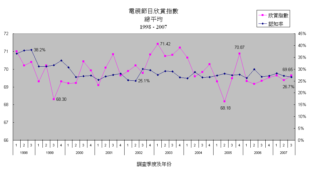 各電視台平均欣賞指數及認知率 (1998 - 2007)