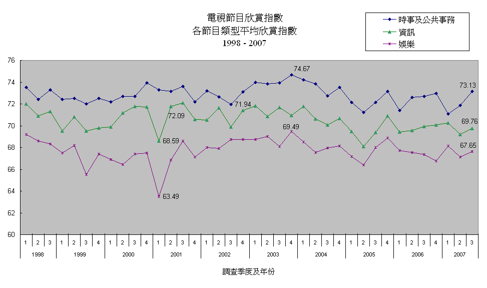 各節目類型平均欣賞指數及認知率 (1998 - 2007)